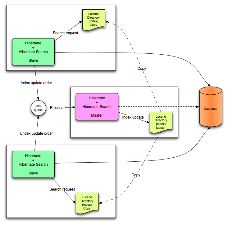 All index update operations applied on a given node are sent to a JMS queue. A unique reader will then process the queue and update the master index. The master index is then replicated on a regular basis to the slave copies. This is known as the master/slaves pattern. The master is the sole responsible for updating the Lucene index. The slaves can accept read as well as write operations. However, they only process the read operation on their local index copy and delegate the update operations to the master.