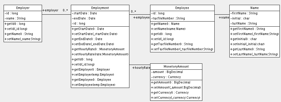 Le modèle suivant de relation entre Employer et Employee utilise une vraie classe entité (Employment) pour représenter l'association. On a fait cela parce qu'il peut y avoir plus d'une période d'emploi pour les deux mêmes